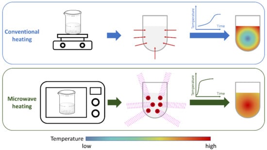 Schematic difference between conventional and microwave heating.