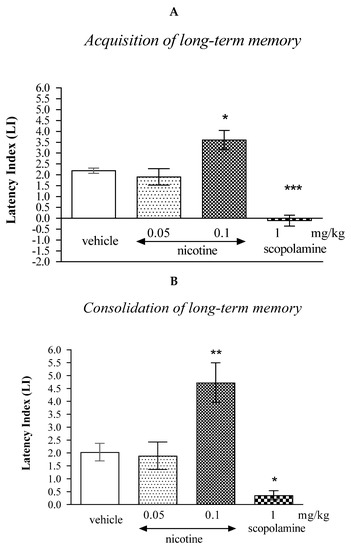 Similarly, in the case of consolidation of memory, a Tukey’s post hoc test confirmed that an acute s.c. administration of nicotine at the higher dose (0.1 mg/kg) significantly increased LI values in mice compared to those in the vehicle-treated control group (p < 0.01) indicating that nicotine, at this used dose, improved the long-term consolidation of memory and learning processes in the PA test in mice. An acute i.p. administration of scopolamine (1 mg/kg) significantly decreased LI values in mice compared to those in the vehicle-treated control group (p < 0.05) indicating that scopolamine, at this used dose, impaired the long-term consolidation of memory and learning processes in the PA test in mice (Figure 1B).