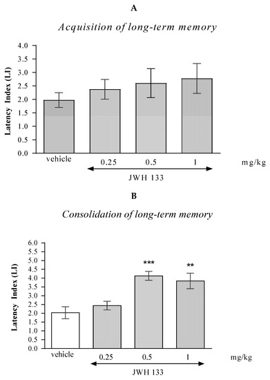 The influence of an acute administration of JWH 133 on the cognition-related responses, expressed as latency index (LI), during the acquisition (A) and consolidation (B) of memory using the PA test in mice. JWH 133 (0.25, 0.5 or 1 mg/kg) or vehicle were administered 30 min before the first trial (acquisition of memory) or immediately after the first trial (consolidation of memory). The second trial was conducted 24 h after the first one; n = 8–10; the means ± SEM; ** p < 0.01; *** p < 0.001 vs. vehicle-treated group; Tukey’s test.