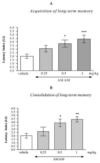 Similarly, in the case of consolidation of memory, a Tukey’s post hoc test confirmed that an acute i.p. administration of AM 630 at the higher doses (0.5 and 1 mg/kg) significantly increased LI values in mice compared to those in the vehicle-treated control group (p < 0.05 for a dose of 0.5 mg/kg and p < 0.01 for a dose of 1 mg/kg) indicating that AM 630, at these used doses, improved the long-term consolidation of memory and learning processes in the PA test in mice (Figure 3B).