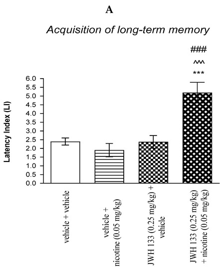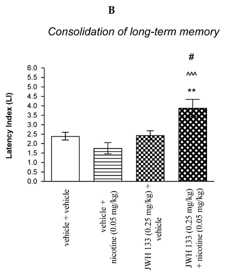 The influence of an acute co-administration of CB2 receptor agonist and non-effective dose of nicotine on the cognition-related responses expressed as latency index (LI) during the acquisition (A) and consolidation (B) memory using the PA test in mice. *** p < 0.001 vs. vehicle/vehicle-treated mice; ^^^ p < 0.001 vs. vehicle/nicotine (0.05 mg/kg)-treated mice; ### p < 0.001 vs. JWH 133 (0.25 mg/kg)/vehicle-treated mice; ** p < 0.01 vs. vehicle/vehicle-treated mice; # p < 0.05 vs. JWH 133 (0.25 mg/kg)/vehicle-treated mice.