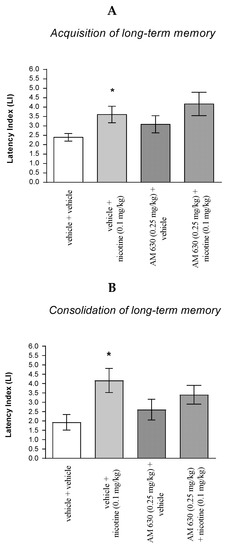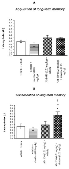 The influence of an acute co-administration of CB2-receptor antagonist and effective (pro-cognitive) dose of nicotine on the cognition-related responses expressed as latency index (LI) during the acquisition (A) and consolidation (B) of memory using the PA test in mice. * p < 0.05 vs. vehicle/vehicle-treated mice.