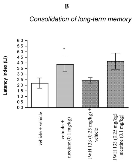 Similarly, for memory consolidation, two-way ANOVA analyses revealed that there was statistically significant effect caused by nicotine (0.1 mg/kg) treatment [F(1.31) = 8.370; p = 0.0069] but there was no statistically significant effect caused by JWH 133 (0.25 mg/kg) pretreatment (F(1.31) = 0.2037; p = 0.6549), and interactions (F(1.31) = 0.001346; p = 0.9710). Additionally, post hoc Bonferroni’s test confirmed that an acute administration of nicotine (0.1 mg/kg) significantly increased LI values in mice in the PA test in comparison to the vehicle/vehicle-treated mice (p < 0.05) confirming that nicotine at this dose used enhanced acquisition of cognition in the PA test in mice (Figure 6B).