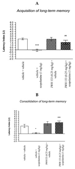 Non-effective dose of CB2-Receptor agonist (JWH 133, 0.25 mg/kg) or vehicle were administered 15 min prior to amnestic dose of cholinergic receptor antagonist (scopolamine, 1 mg/kg). Injections were performed 15 min before the first trial (acquisition of memory) (A) or immediately after the first trial (consolidation of memory) (B). 24 h later, the second trial was conducted; n = 8–12; the means ± SEM; * p < 0.05; *** p < 0.001 vs. vehicle/vehicle-treated group; ^^ p < 0.001; ^^^ p < 0.001 vs. vehicle/scopolamine (1 mg/kg)-treated group; Bonferroni’s test.