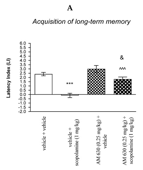 In the case of memory acquisition, a Tukey’s post hoc test confirmed that an acute i.p. administration of AM 630 at the higher doses (0.5 and 1 mg/kg) significantly increased LI values in mice compared to those in the vehicle-treated control group (p < 0.05 for a dose of 0.5 mg/kg and p < 0.001 for a dose of 1 mg/kg) indicating that AM 630, at these used doses, improved the long-term acquisition of memory and learning processes in the PA test in mice (Figure 3A).