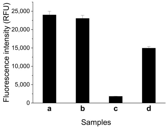 Feasibility test of the fluorescent switch aptasensor for AFB1 detection by measuring different samples. (a) FDNA; (b) FDNA+QDNA; (c) FDNA+QDNA+aptamer; and (d) FDNA + QDNA + aptamer + AFB1. Assay buffer was 10 mM Tris-HCl (pH 7.5) solution containing 50 mM MgCl2, 50 mM NaCl, and 0.1% Tween 20. FDNA concentration was 50 nM. Aptamer (Af27) concentration was 100 nM. QDNA (Af27-C13Q) concentration was 100 nM. AFB1 concentration was 200 nM. Incubation at 4 °C for 60 min was applied.