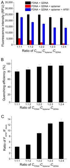 Effects of different concentration ratios between FDNA, aptamer, and QDNA (CFDNA:CAptamer:CQDNA) on (A) fluorescence intensity of samples, (B) quenching efficiency, and (C) ratio of FAFB1/Fblank. Assay buffer was 10 mM Tris-HCl (pH 7.5) solution containing 50 mM MgCl2, 50 mM NaCl, and 0.1% Tween 20. FDNA concentration was fixed at 50 nM. AFB1 concentration was 200 nM. Af27 and Af27-C13Q were used as aptamer and QDNA, respectively. Incubation at 4 °C for 60 min was applied.