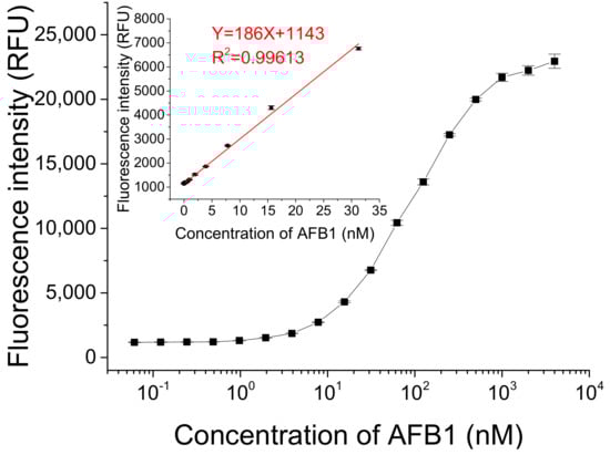 We investigated the effect of MgCl2 concentration on detection of AFB1 (Figure S2). Upon addition of MgCl2, the quenching efficiency and the ratio of FAFB1/Fblank all increased, which can be explained due to the fact that Mg2+ promotes both DNA hybridization and aptamer–AFB1 binding [16,17]. Finally, 50 mM MgCl2 was chosen because FAFB1/Fblank reached the maximum value at this condition. Only a slight effect of NaCl concentration on fluorescence intensity was observed (Figure S3) in the presence of 50 mM MgCl2, consistent with previous study [16,17]. Finally, we chose to add 50 mM NaCl in assay buffer.