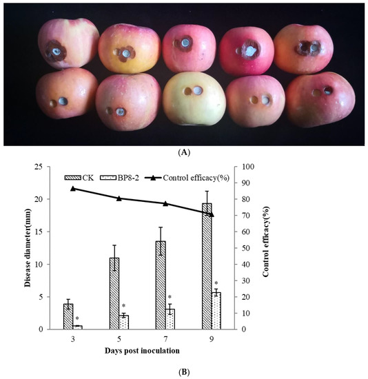 4.9. Control Effect of the Antifungal Protein BP8-2 on P. expansum In Vivo