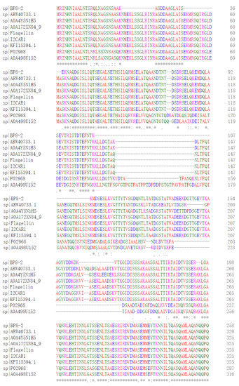 - Eckhard, U.; Bandukwala, H.; Mansfield, M.J.; Marino, G.; Cheng, J.J.; Wallace, I.; Holyoak, T.; Charles, T.C.; Austin, J.; Overall, C.M.; et al. Discovery of a proteolytic flagellin family in diverse bacterial phyla that assembles enzymatically active flagella. Nat. Commun. 2017, 8, 521. [Google Scholar] [CrossRef] [PubMed]