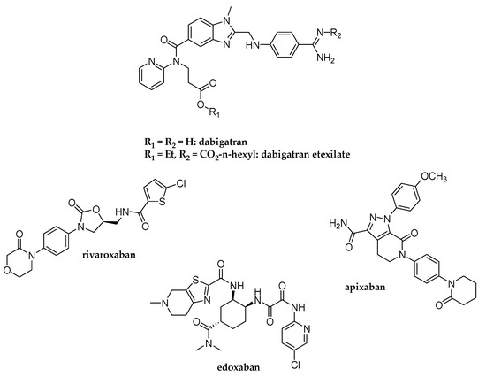 Currently approved DOACs (Figure 1) are dabigatran (available as the etexilate prodrug (Pradaxa), which acts as an inhibitor of both free and fibrin-bound thrombin), as well as apixaban (Eliquis), rivaroxaban (Xarelto), and edoxaban (Lixiana), which instead are factor Xa (fXa)-selective reversible inhibitors [8,9].