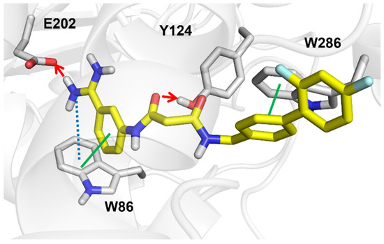 Zoomed in view at AChE binding site. The best 19h docked pose is rendered in yellow sticks. Red arrows and blue and green dashed lines indicate hydrogen bonds, cation–π, and π–π interactions, respectively.