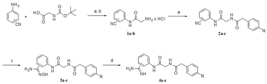 After the removal of the BOC protecting group, the obtained hydrochloride salts 1a–b were coupled with suitable phenylacetic acids as the P4 element. The intermediates 2a–c underwent a two-step transformation. They were converted to the corresponding hydroxyimino derivatives 3a–c by reacting with hydroxylamine hydrochloride and sodium carbonate in abs. EtOH, and in the second step, underwent a catalytic reduction in an acidic hydroalcoholic mixture (EtOH: water, 2:1 v/v; dilute HCl), using palladium on carbon (10% Pd-C) to obtain the final benzamidine derivatives 4a–c.