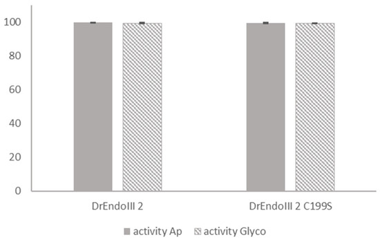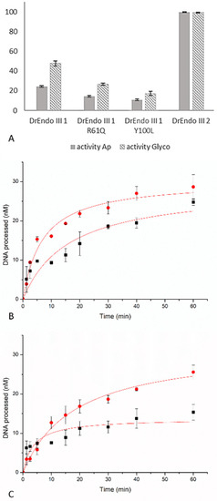 It can be further observed that the activity of DrEndoIII1 Y100L was more affected than that of DrEndoIII1 R61Q. The latter revealed a decrease of approximately 42% and 45% for AP-lyase and DNA glycosylase activities, respectively, whereas Y100L showed a decrease of 55% and 64% when compared with the native enzyme.