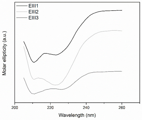 Thermal stability of DrEndoIII1, 2 and 3 and the three mutants (R61Q, Y100L and G250T/N251H) was analyzed by CD spectroscopy in the 20 to 95 °C interval. The CD spectra demonstrate, as expected, a typical α-helical structure for the wild-type enzymes (Figure 4) and the mutants (Figure S2). The respective melting points (Tm) were determined by monitoring CD spectra during a stepwise increase of the temperature. The same Tm (around 60 °C) was observed for all enzymes, revealing that the mutations did not affect the stability of the proteins (Table S4).