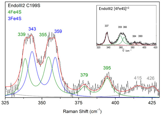 Fine structural details on the cluster in DrEndoIII2 C199S, obtained by RR spectroscopy, reveal a presence of co-existing [3Fe-4S] and [4Fe-4S] cluster populations (Figure 8).