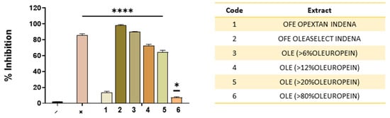 For initial screening, five other olive extracts were examined. In particular, another olive fruit extract (Olive powder extract Opextan®, Indena) and four OLE (i.e., Olea europaea leaves powder extract >6, >12, >20% oleuropein, purchased from Farmalabor, Italy, and >80% oleuropein, Sabinsa Europe GmbH, Langen, Germany) have been taken into account.