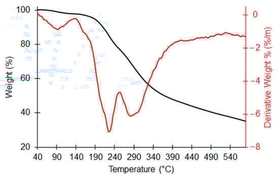 This finding was also confirmed by TGA analysis, reported in Figure 3. Indeed, the thermal events were manifold, as can be seen from the derivative thermogram (DGTA), indicating that this dry extract is certainly a mixture of several organic compounds. However, two main peaks can be detected at 225.8 and 304.6 °C corresponding to pyrolytic events accounting for 13.8 and 24.7% of the weight-loss percentage, respectively. We hypothesized that hydroxytyrosol thermal decomposition fell in this second stage (even if it could not be excluded in the co-presence of other species decomposing in the same temperature range) since, in the literature, its decomposition was found to occur between 262.8 and 409.7 °C, with a maximum at 305.2 °C []. The residue at 800 °C is equal to 15.4%, which is indicative of the presence of inorganic salts or species (as also confirmed by the surface chemical composition reported in Figure 2B). The Tonset (i.e., the temperature corresponding to the 1% weight loss) was found to be 176.3 °C, thus indicating the high thermostability of the natural extract. The water and/or volatile content was equal to 0.1%.