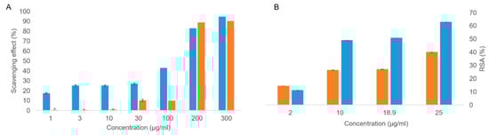 The ABTS and DPPH antioxidant assays were performed on both the OFE and hydroxytyrosol. As far as the ABTS radical scavenging test is concerned (Figure 4A), the olive extract provided excellent antioxidant activity even at low concentrations (1 μg/mL), with the highest activity at 300 μg/mL (scavenging effect: 94.5%). A high scavenging effect for hydroxytyrosol at 300 µg/mL was also detected (89.9%), although this molecule did not show a gradual improvement in antioxidant activity as the concentration increased but rather an on–off behavior. In the DPPH test (Figure 4B), the olive extract displayed good antioxidant activity, which is proportional to the concentration, in agreement with what was observed by the ABTS test. On the other hand, hydroxytyrosol showed concentration-dependent antioxidant activity, unlike the ABTS test results. Both tests revealed that the OFE antioxidant performances were higher than those observed for hydroxytyrosol, suggesting the presence of different active species in the extract.