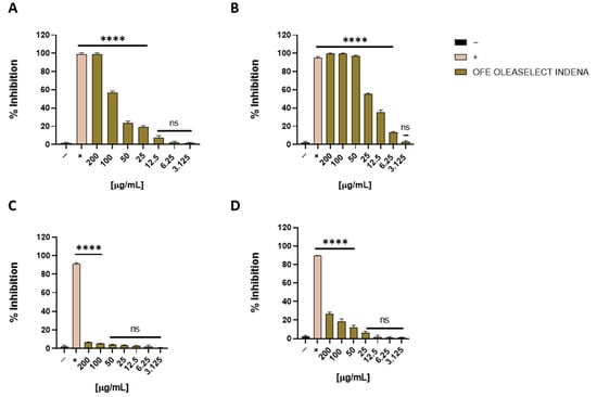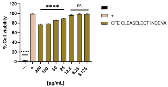 Cytotoxic activity of OFE. Cell viability was evaluated by MTT assay after Vero cell treatment with OFE for 24 h at different concentrations (from 200 to 3.125 μg/mL). Non-treated cells were used as the positive control (+), whereas DMSO was used as the negative control (−). Statistical analyses were determined by one-way ANOVA with Dunnett’s test for multiple comparisons. Significances are referred to as the untreated cells (+). **** p < 0.0001; ns: non-significant.