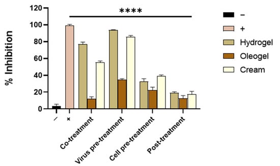 Antiviral activity of OFE formulations against HSV-1. Different assays were performed in order to evaluate anti-HSV-1 activity. Hydrogel and cream formulations interfered with the early stages of infection, acting in co-treatment and virus pre-treatment assays, although they did not exhibit any relevant antiviral activity either in cell pre-treatment or post-treatment tests. Statistical analyses were determined by ANOVA with Dunnett’s test for multiple comparisons. Significances are referred to as the negative control (−). **** p < 0.0001.
