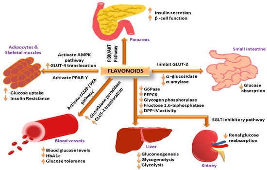 Flavonoids exerting antidiabetic activity via different mechanistic pathways: Flavonoids increase insulin secretion and improve β-cell function via the PI3K/AKT signaling pathway; increase GLUT-4 translocation through AMPK activation to increase glucose uptake in adipose tissues and skeletal muscles; activate PPAR-γ expression to decrease insulin resistance; activate cAMP/PKA pathway to reduce blood glucose levels and improve glucose tolerance; increase glutathione peroxidase activity to reduce HbA1c levels; decrease G-6-Pase, PEPCK, glycogen phosphorylase, fructose 1,6-biphosphatase and DPP-IV activity in liver to decrease gluconeogenesis, glycogenolysis, and glycoslysis; inhibit SGLT pathway in kidney to decrease renal glucose reabsorption; inhibit GLUT-2, α-amylase and α-glucosidase activity to decrease glucose absorption in the small intestine.