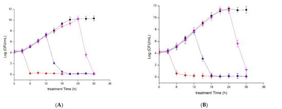 Inhibitory kinetics of plantaricin YKX against S. aureus ATCC 25923 (A) and S. aureus CMCC 26570 (B). (■): Control (without plantaricin YKX treatment); plantaricin YKX was added at the early-stage phase (●), at the mid-exponential phase (▲), and the stationary phase (▼).