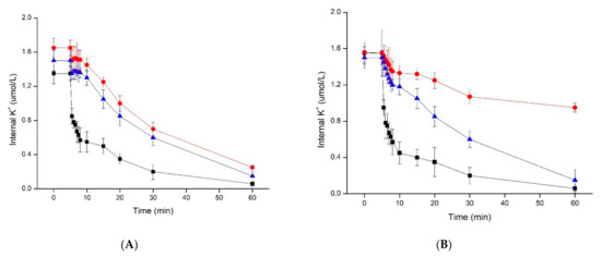 Efflux of K+ from cells of S. aureus ATCC 25923 (A) and S. aureus CMCC 26570 (B) after treatment with plantaricin YKX at pH 8 (●), pH 7 (▲), and pH 6 (■).