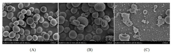 SEM was conducted according to Pei et al., 2018 [24]. Mid-logarithmic-phase S. aureus ATCC 25923 was treated with plantaricin YKX at a final concentration of 1 MIC or 2 MIC for 1 h. The samples without plantaricin YKX treatment were considered controls. After fixation with 2.5% glutaraldehyde solution, the samples were dehydrated with a serial concentration of ethanol. Then, the samples were observed with an SU-8010 field emission SEM (Hitachi High New SU8010 Series, Hitachi High-Tech Co., Ltd., Tokyo, Japan).