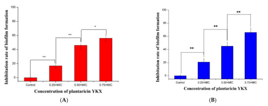 Effect of plantaricin YKX on S. aureus biofilm formation. S. aureus ATCC 25923 (A) and S. aureus CMCC 26570 (B). * significant. p < 0.05; ** highly significant. p < 0.01.