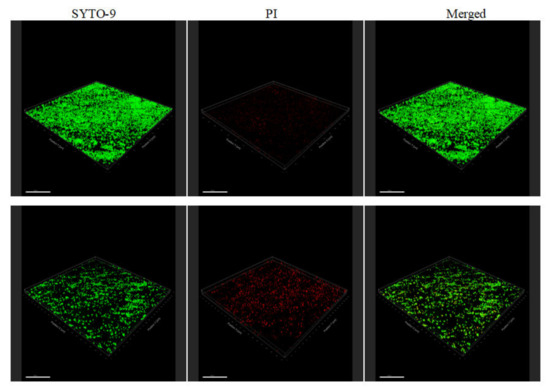 Mid-logarithmic-phase S. aureus ATCC 25923 was added to plantaricin YKX at a final concentration of 1/2 MIC. The isolate was cultured at 37 °C for 3 days for biofilm formation. The samples without plantaaricin YKX treatment were used as controls. According to the manufacturer’s instructions [25], a LIVE/DEAD BacLight Bacterial Viability Kit/SYTO9/PI dye (Cell Viability, Proliferation & Function) was used to stain the samples for 30 min. Confocal laser microscopy (1000× oil lens) was used to photo the samples with a SYTO 9 excitation wavelength of 480 nm, an emission wavelength of 500 nm, a PI excitation wavelength of 490 nm, and an emission wavelength of 635 nm.