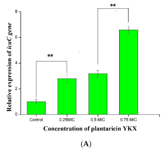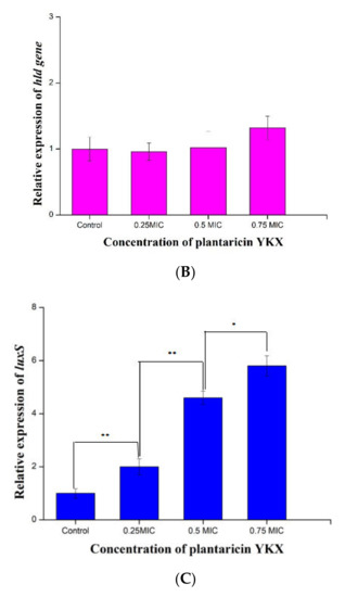 The expression of the luxS and icaC genes of S. aureus ATCC 25923 increased significantly (p < 0.05) after being cocultured with plantaricin YKX at 1/4× MIC, 1/2× MIC, and 3/4× MIC (Figure 8). However, the expression of the hld genes of S. aureus ATCC 25923 after plantaricin YKX treatment was not changed significantly (p > 0.05) (Figure 8C).