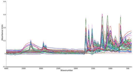 In this study, the number of smoothing points was set to 15 and the polynomial order was set to 2, since the spectra showed the best smoothing results when 15 smoothing points and 2 polynomial orders were applied. The derivative method was used in this work because it seemed to provide the best separation when performing PCA. In addition, the preprocessed data were subjected to another pretreatment, namely, the Standard Normal Variate (SNV) preprocessing technique. SNV calculates the average intensity value and subtracts it from each spectrum to normalize it [39]. The spectrum is then divided by the square root of the sum of squared intensities (the standard deviation). SNV was applied to improve the spectra and obtain the best results of separation when performing PCA by reducing the scattering effects. Figure 3 and Figure 4 show the line plots after performing the preprocessing techniques.