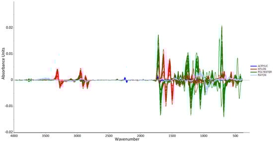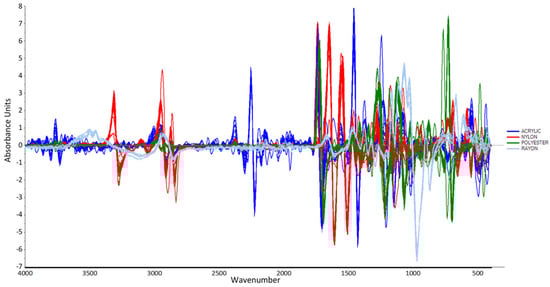 A number of 138 synthetic fiber samples were supplied by microtrace manufacturers, which is an independent laboratory, headed by Skip Palenik, that specializes in microscopy and microchemistry for the identification of trace amounts of unknown compounds and single microscopic particles. For this study, the FT-IR Microscope “LUMOS–Bruker” was used to obtain the spectra of fiber samples. This instrument has a diamond crystal for attenuated total reflectance (ATR) data. Opus software (7.5) was used for collecting the spectrum in the mid infrared range of 4000–400 cm−1. Direct samples were taken and placed on ATR–FT-IR Crystal for the analysis; all samples were scanned to 100 scans with a resolution of 4 cm 1 . To remove background effects on the samples, a background (air) measurement was performed; moreover, polystyrene film was used as a standard to ensure the performance of the instrument. After each sample analysis, to avoid cross contamination, the ATR crystal was cleaned with ethanol. Each sample was scanned for three trials and an average spectrum was obtained. After that, the spectra were smoothed automatically using OPUS software to enhance the FT-IR spectrum quality [36].