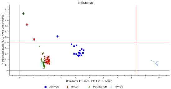 The influence plot helps identify possible outliers that could affect the model. Samples that lie above the horizontal line in the influence diagram are considered outliers that are not in the model, while samples that lie below the horizontal line and to the right of the vertical line are considered to be in the model, but extreme. In addition, any sample that lies above the horizontal line and to the right of the vertical line is considered an extreme outlier that would negatively affect the model. From the influence diagram in Figure 6, we were able to identify four outliers that were above the horizontal line and would greatly influence the model. Two of the outliers were nylon samples, one was polyester, and one was acrylic. These samples could also be observed to deviate from their groups in the scores plot. Therefore, the outliers were marked and then the PCA was recalculated without the marked samples. In addition, all rayon samples are distributed together to the right of the vertical line and below the horizontal line. This means that the rayon samples are extreme compared to other samples, which is very important information for the model to distinguish rayon from the other types.