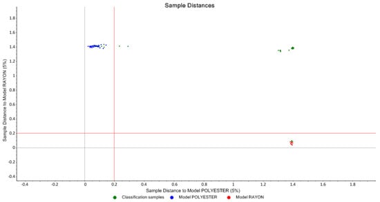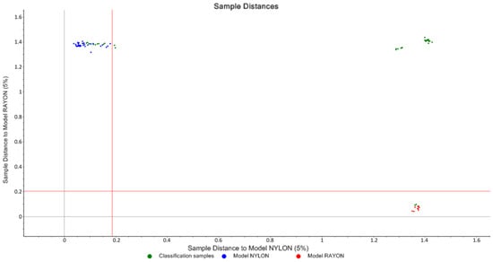 Figure 8 shows Cooman’s plot of polyester vs. rayon, with the polyester group in the upper left quadrant and the rayon group in the lower right quadrant. There were no samples in the lower left quadrant, signifying that no sample was categorized into both categories at the same time. All test samples were accurately categorized into their actual groups. However, two polyester test samples lie on the right of the vertical line, where the ordinate value for both samples is above 0.2, while the ordinate value of polyester classification is 0.20 when the significance limit of the distance to the nylon model is set to 5%. As a result, those two samples were not classified as polyester samples by the SIMCA method, as shown in Table 1. However, the given sample distance is extremely near to the polyester model and quite far from the other models, so both samples can be classed as polyester.
