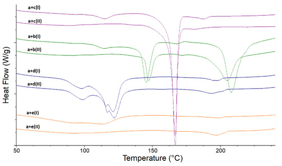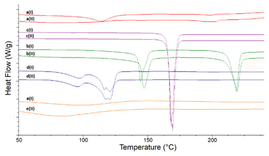 DSC curves of LINA and excipients are presented in Figure 2, both of the non-stressed samples (upper curves) and of the stressed ones (lower curves). The curve of non-stressed LINA (Figure 2, curve a(I)) reveals two broad endotherms, the first with the peak at 113.0 °C and the second one (much smaller) with the peak at 198.7 °C. Both peaks are asymmetric with broader arms at lower temperatures. After high-temperature/high-humidity stress the endotherms of LINA changed (Figure 2, curve a(II)), revealing their complex nature. The peak in the first endotherm moved to 83 °C and was overlapped with another peak around 110 °C. The shape of the second endotherm suggests two peaks at 196 °C and 202 °C with enthalpy around 20 J/g, which was larger than the same for the non-stressed sample (around 10 J/g). In addition, some interesting observations and comparisons were made using DSC curves of pure excipients. It was noticed that some thermal processes of non-stressed MGS and PVP took place in the same temperature ranges as the first endotherm of pure LINA. When the stressed excipients were examined, it was observed that high-temperature and high-humidity stress did not influence thermal processes of LAC, MAN and MGS. However, the curve of the stressed PVP is to some extent different than that of the non-stressed compound, i.e., the peak in the first endotherm moved to a lower temperature, around 84 °C (Figure 2).