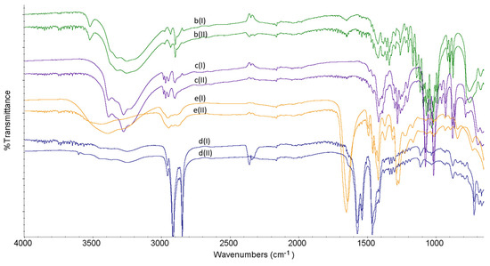 FT-IR spectra for lactose (b), mannitol (c), magnesium stearate (d) and polyvinylpyrrolidone (e) in the non-stressed (I) and stressed (II) samples.
