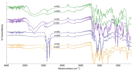FT-IR spectra for binary mixtures of linagliptin (a) with lactose (b), mannitol (c), magnesium stearate (d) and polyvinylpyrrolidone (e) in the non-stressed (I) and stressed (II) samples.