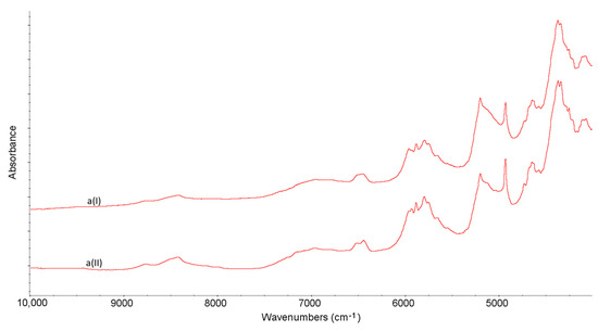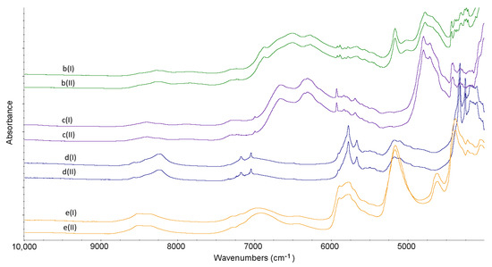 FT-IR and NIR spectra were recorded on a Nicolet 6700 spectrometer (ThermoScientific, Waltham, MA, USA) equipped with a Smart iTR™ ATR Sampling Accessory and Near IR Integrating Sphere. After recording background spectra, the samples were analyzed over the ranges 4.000–650 cm−1 for FT-IR and 10.000–4000 cm−1 for NIR measurements. Each spectrum was recorded as an average of four scans. For analyzing all the spectra, OMNIC software from ThermoScientific was applied.