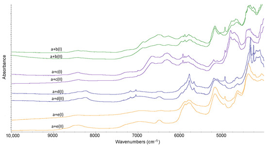 NIR spectra for binary mixtures of linagliptin (a) with lactose (b), mannitol (c), magnesium stearate (d) and polyvinylpyrrolidone (e) in the non-stressed (I) and stressed (II) samples.