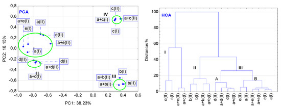 Findings of multivariate calculations using NIR data: PCA score scatter plot, and HCA tree diagram. Linagliptin = a(I) and a(II), lactose = b(I) and b(II), mannitol = c(I) and c(II), magnesium stearate = d(I) and d(II), and polyvinylpyrrolidone = e(I) and e(II). Physical mixtures of linagliptin with lactose = a + b(I) and a + b(II), mannitol = a + c(I) and a + c(II), magnesium stearate = a + d(I) and a + d(II), and polyvinylpyrrolidone = a + e(I) and a + e(II). (I and II) denote the non-stressed and stressed samples, respectively.