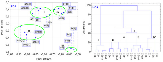 To avoid misinterpretation of the thermal data, hierarchical cluster analysis (HCA) was also used for the analysis of the DSC curves as a second multivariate statistical method. In general, the findings of the HCA calculations are consistent with those obtained using PCA. Figure 10 (HCA) shows that non-stressed and stressed samples of LINA, excipients alone (MAN, LAC, MGS and PVP), and LINA binary mixtures with these excipients are linked together in the same way, as was the case for the PCA score scatter plot (Figure 10 (PCA)). MAN and LAC, and their mixtures with LINA, form clusters I and II, respectively. Cluster III created on the HCA tree diagram could be divided into two subclusters, IIIA and IIIB. The former cluster contains the non-stressed and stressed MGS and its mixture with LINA, whereas the latter is created by the non-stressed and stressed LINA and PVP alone, and their mixture. Thus, the HCA diagram reveals that the four excipients and their mixtures with LINA create four clusters (I-IV), taking into account similarities in their thermal properties.