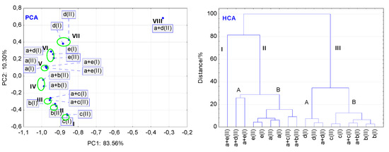The correlation matrix was used for PCA calculations. The values of the first three principal components (PC1, PC2 and PC3) are listed in Table 4. As the first two PCs explained the highest percentage of total variance, sample classifications were performed using a 2D score scatter plot (PC1 and PC2), without rotation. Ward’s method and Euclidean distance were applied in the case of HCA calculations and findings obtained were visualized as a tree diagram referring to 100% of dissimilarity.