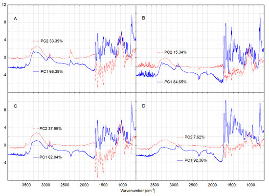 Overall, outcomes of these studies can be obtained by a comparison of the plots developed for PC1 and PC2 values, which were calculated for four successive matrices. As an example, Figure 13 shows the results of PCA calculations using FT-IR data for LINA and its mixture with LAC. Comparing PC1 and PC2 lines calculated using the first matrix (Figure 13, lines A, LINA and LAC alone) with those lines for PC1 and PC2 obtained for the second matrix (Figure 13, lines B, LINA and its mixture with LAC), both under non-stressed conditions, the impact of the excipient (LAC) on the chemical stability of LINA can by assessed by taking into account the changes in absorption bands of LINA. Findings obtained after this comparison for all the excipients used in this study (LAC, MAN, MGS and PVP) are listed in Table 3. On the other hand, comparing PC1 and PC2 lines calculated using the first matrix (Figure 13, lines A, LINA and LAC alone under non-stressed conditions) with those lines for PC1 and PC2 obtained for the third matrix (Figure 13, lines C, LINA and LAC alone under stressed conditions), the effect of high temperature and high humidity on the chemical stability of LINA can be evaluated (Table 3). Additionally, detailed analysis of the PC1 and PC2 lines calculated using the fourth matrix (Figure 13, lines D, LINA and its mixture with LAC under stressed conditions) with PC1 and PC2 lines obtained for each other matrix enable us to determine if there are additional differences that were not seen separately to the effects of the excipient (LAC) or stressed conditions on the drug substance (LINA).
