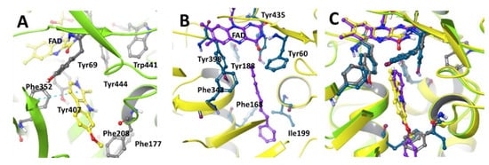 Active site configuration of human (A) MAO-A (PDB structure 2Z5X) with harmine and (B) MAO-B (PDB structure 1OJ9) with 1,4,-diphenyl butene, depicting key amino acids lining the enzyme active site. (C) Overlaid view of MAO-A and MAO-B substrate binding site. Harmine and 1,4,-diphenyl butene are selective reversible inhibitors of MAO-A and MAO-B, respectively.