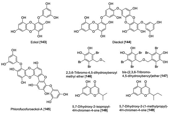 - Jung, H.A.; Roy, A.; Jung, J.H.; Choi, J.S. Evaluation of the inhibitory effects of eckol and dieckol isolated from edible brown alga Eisenia bicyclis on human monoamine oxidases A and B. Arch. Pharm. Res. 2017, 40, 480–491. [Google Scholar] [CrossRef] [PubMed]