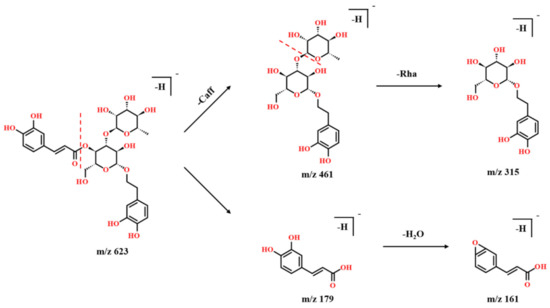 Eighteen phenylethanoid glycosides (PhGs) from PAL were characterized in the negative ion mode shown in Table S1, Supplementary Materials. The neutral loss of phenylethanoid glycosides was 162Da, 152Da, and 146Da, and fragments at m/z 179 and 161 were detected frequently, which were produced by caffeic acid and anhydroglucose. Compound 42 was determined as acteoside by comparing it with the reference compound. The characteristic mass spectra of acteoside are shown in Figure 3. It shows the [M-Caff-H]− ion at m/z 461, then the fragment ion at m/z 315 was obtained by the loss of a rhamnose. The ions at m/z 179 and 161 were detected as the characteristic ions of phenylethanoid glycosides. Figure S2, Supplementary Materials shows the fragments of acteoside detected by UHPLC-Q-TOF-MS. Compounds 44 and 45 showed the same fragments and m/z as acteoside, so they are isomers. According to their different RT and references [4], compounds 44 and 45 were determined as isoacteoside and forsythiaside.