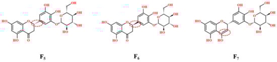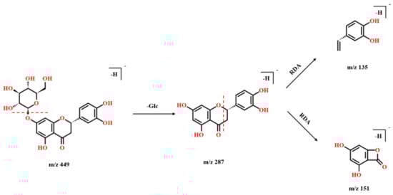 Flavonoids are one of the largest classes of natural compounds. The developing study in flavonoids is mainly due to their good antioxidant activity [27]. In this study, twenty flavonoids were characterized from PAL, as shown in Table S1. The characteristic neutral losses of flavonoids were Glu and H2O, and many of these flavonoids have a characteristic fragment at m/z 151, which is a product of the RDA reaction. Compound 51 (miscanthoside) was taken as an example to illustrate the identification process of flavonoids. Figure 4 shows the possible fragmentation mode of Compound 51. Compound 51 was detected at m/z 449. The [M-H-Glc]− ion was detected at m/z 287, and an RDA reaction occurred to produce ions at m/z 151 and 135. Therefore, it was determined as miscanthoside. Figure S3 shows the fragments of miscanthoside detected by UHPLC-Q-TOF-MS.