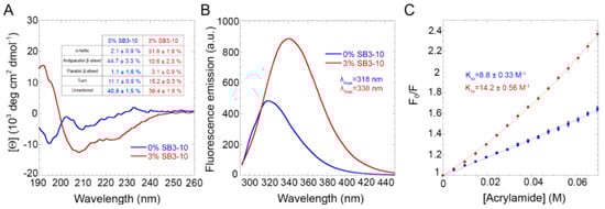 The intrinsic fluorescence spectrum of TDP-43 NTD in the absence of SB3-10 showed a single peak at 319 nm, indicating a fully folded structure, with the Trp68 residue well buried in the hydrophobic core of the protein (Figure 1B). In 3.0% SB3-10, the intrinsic fluorescence increased in intensity and underwent a red-shift to 339 nm, showing a Trp68 residue more exposed to the solvent and a partially folded structure (Figure 1B). The degree of solvent exposure of the Trp68 residue of TDP-43 NTD was also studied using a Stern–Volmer assay with acrylamide as a quencher (Figure 1C). TDP-43 NTD treated with 0.0% SB3-10 showed a linear plot of F0/F versus acrylamide concentration with a KSV value of 8.8 ± 0.3 M−1, while TDP-43 NTD treated with 3.0% SB3-10 showed a non-linear plot, with a KSV value of 14.3 ± 0.6 M−1 and a KST value of 4.5 ± 0.2 M−1 (Figure 1C). The higher KSV value (p < 0.01) and the presence of a static quenching component (KST) indicate a greater exposure of the Trp68 residue to the solvent for the protein domain in 3.0% SB3-10.